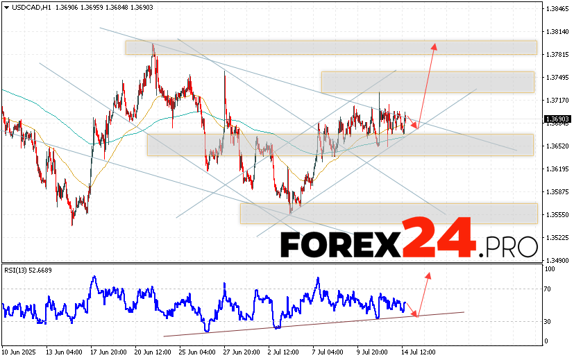 Canadian Dollar Forecast USD/CAD for July 15, 2025 suggests an attempt to test the support area near the 1.3675 level. Further, growth will continue to the area above the 1.3805 level. An additional signal in favor of the rise of the Canadian dollar on Forex will be a test of the support line on the relative strength indicator. A fall and breakout of the 1.3625 level will cancel the USD/CAD growth scenario. This will indicate a continuation of the decline in the asset’s value with a potential target below the 1.3475 level.