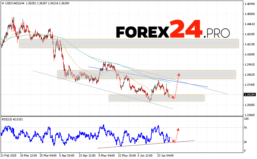 Canadian Dollar Forecast USD/CAD for July 2, 2025suggests an attempt to test the support area near the 1.3585 level. Further, growth will continue to the area above the 1.3865 level. An additional signal in favor of the rise of the Canadian dollar on Forex will be a test of the support line on the relative strength indicator. A fall and breakout of the 1.3505 level will cancel the USD/CAD growth scenario. This will indicate a continuation of the decline in the asset’s value with a potential target below the 1.3325 level.