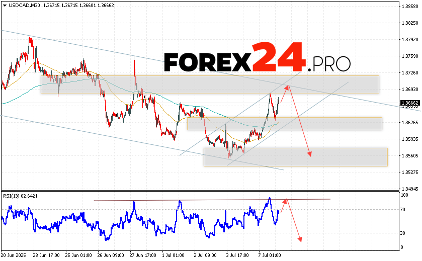 Canadian Dollar Forecast USD/CAD for July 8, 2025 suggests an attempt to test the resistance area near the level of 1.3695. Further, the continuation of the decline to the area below the level of 1.3565. An additional signal in favor of the decline of the Canadian Dollar on Forex will be a test of the resistance line on the relative strength indicator. A strong growth and breakdown of 1.3735 level will cancel the variant of USD/CAD quotes decline. This will indicate the continuation of the rise in the value of the asset with a potential target above the level of 1.3985.
