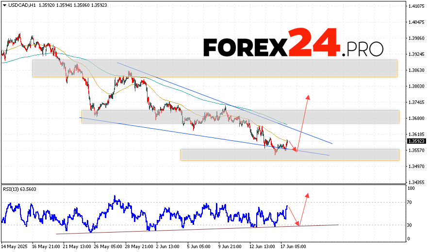 Canadian Dollar Forecast USD/CAD for June 18, 2025 suggests an attempt to test the support area near the 1.3545 level. Further, continued growth to the area above the 1.3765 level. An additional signal in favor of the Canadian dollar’s rise on Forex will be a test of the support line on the relative strength indicator. A fall and breakout of the 1.3475 level will cancel the USD/CAD growth scenario. This will indicate a continuation of the asset’s decline with a potential target below the 1.3295 level.