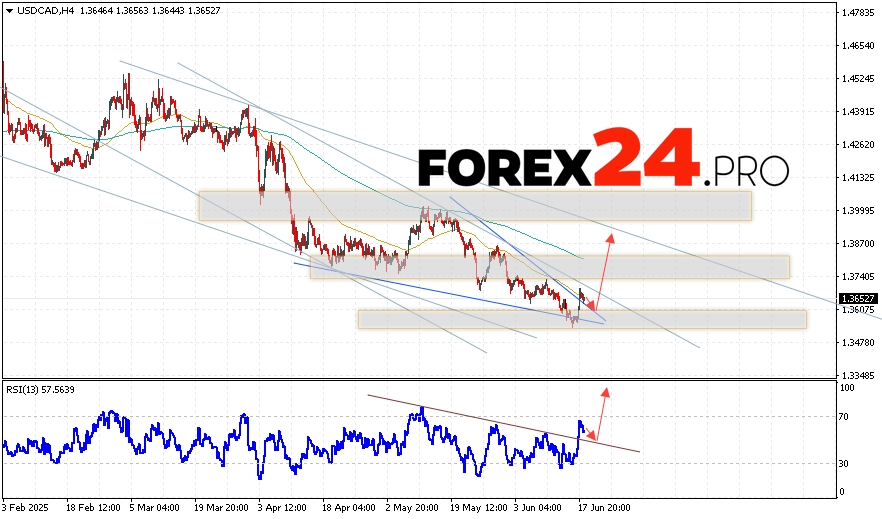 Canadian Dollar Forecast USD/CAD for June 19, 2025 suggests an attempt to test the support area near the 1.3595 level. Further, growth will continue to the area above the 1.3875 level. An additional signal in favor of the rise of the Canadian dollar on Forex will be a test of the support line on the relative strength indicator. A fall and breakout of the 1.3445 level will cancel the USD/CAD growth scenario. This will indicate a continuation of the asset’s decline with a potential target below the 1.3235 level.