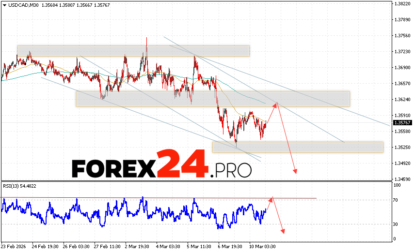 Canadian Dollar Forecast USD/CAD for March 11, 2026 suggests an attempt to test the resistance area near 1.3605. Subsequently, a continued decline below 1.3475. An additional signal favoring a decline in the Canadian Dollar on Forex will be a test of the resistance line on the relative strength indicator. A strong rally and a breakout of 1.3685 would cancel out the USD/CAD price decline. This would indicate continued price growth with a potential target above 1.3975.