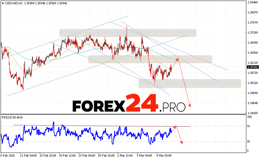 Canadian Dollar Forecast USD/CAD for March 12, 2026 suggests an attempt to test the resistance area near 1.3610. Subsequently, a continued decline below 1.3455. An additional signal favoring a decline in the Canadian Dollar on Forex will be a test of the resistance line on the relative strength indicator. A strong rally and a breakout of 1.3675 would cancel out the USD/CAD price decline. This would indicate continued price growth with a potential target above 1.3985.