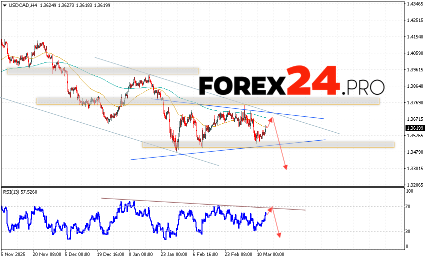 Canadian Dollar Forecast USD/CAD for March 13, 2026 suggests an attempt to test the resistance area near 1.3675. Subsequently, a continued decline below 1.3375. An additional signal supporting a decline in the Canadian dollar on Forex will be a test of the resistance line on the relative strength indicator (RSI). A strong rally and a breakout of 1.3775 would cancel out the downward trend in USD/CAD. This would indicate continued price appreciation with a potential target above 1.4065.
