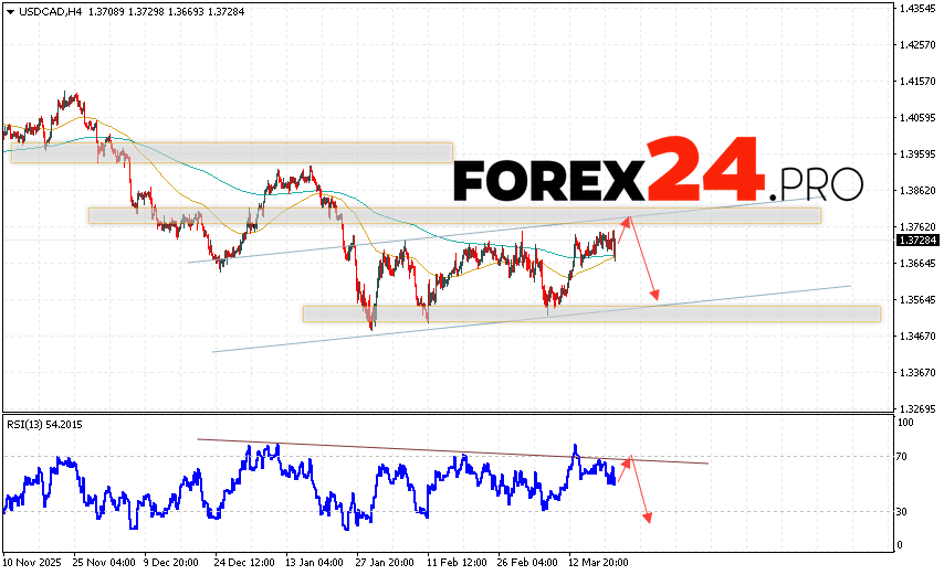 Canadian Dollar Forecast USD/CAD for March 24, 2026 suggests an attempt to test the resistance area near 1.3760. Subsequently, a continued decline below 1.3565. An additional signal supporting a decline in the Canadian dollar on Forex will be a test of the resistance line on the relative strength indicator (RSI). A strong rally and a breakout of 1.3865 would cancel out the downward trend in USD/CAD. This would indicate continued price appreciation with a potential target above 1.4185.