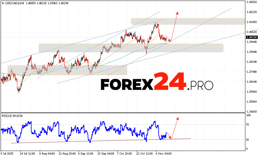 Canadian Dollar Forecast USD/CAD for November 14, 2025 suggests an attempt to test the support area near 1.3985. Subsequently, continued growth is expected above 1.4225. An additional signal supporting the Canadian Dollar’s rise on Forex will be a test of the support line on the relative strength indicator. A decline and a break of 1.3905 would cancel out the upside potential for USD/CAD. This would indicate continued declines in the asset’s price, with a potential target below 1.3685.