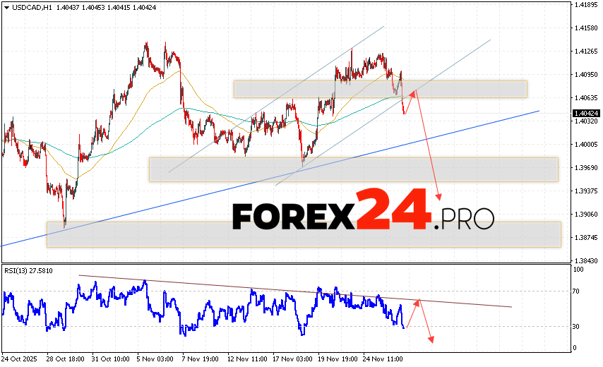 Canadian Dollar Forecast USD/CAD for November 27, 2025 suggests an attempt to test the resistance area near 1.4070. Subsequently, a continued decline to below 1.3905 is expected. An additional signal supporting a decline in the Canadian Dollar on Forex will be a test of the resistance line on the relative strength indicator (RSI). A strong rally and a breakout of 1.4165 would cancel out the downward trend in USD/CAD quotes. This would indicate continued price growth with a potential target above 1.4305.