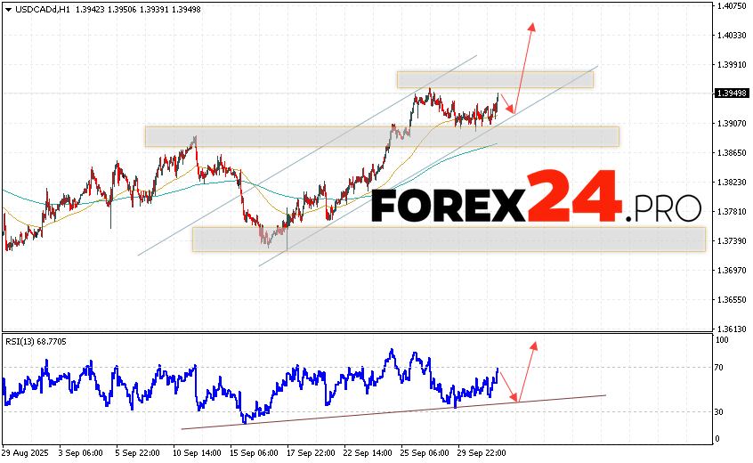Canadian Dollar Forecast USD/CAD for October 2, 2025 suggests an attempt to test the support area near 1.3925. Subsequently, continued growth is expected above 1.4065. An additional signal supporting the Canadian Dollar’s rise on Forex will be a test of the support line on the relative strength indicator. A decline and a break of 1.3875 would cancel out the upside potential for USD/CAD. This would indicate continued declines in the asset’s value, with a potential target below 1.3635.