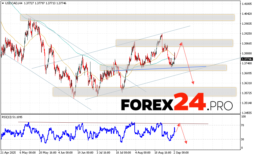 Canadian Dollar Forecast USDCAD for September 3, 2025 suggests an attempt to test the resistance area near the level of 1.3865. Further, the fall continues to the area below the level of 1.3635. An additional signal in favor of the decline of the Canadian Dollar on Forex will be a test of the resistance line on the relative strength indicator. The cancellation of the option of a fall in USD/CAD quotes will be a strong growth and a breakout of the level of 1.3945. This will indicate a continued growth in the value of the asset with a potential target above the level of 1.4145.