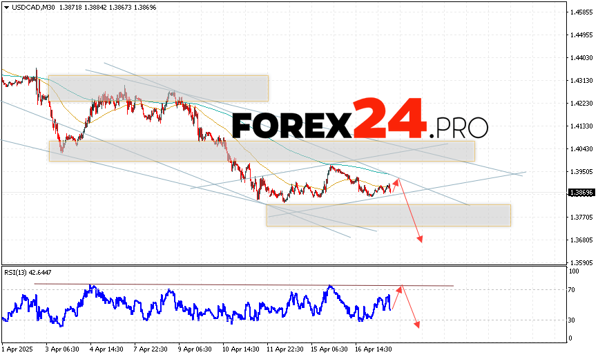 Canadian Dollar Forecast USDCAD for April 18, 2025 suggests an attempt to test the resistance area near 1.3925. Further, a continuation of the fall to the area below 1.3675. An additional signal in favor of the decline of the Canadian Dollar on Forex will be a test of the trend line on the relative strength indicator. Cancellation of the option of a fall in USD/CAD quotes will be a strong growth and a breakout of the 1.4005 level. This will indicate a continuation of the rise in the value of the asset with a potential target above the 1.4265 level.
