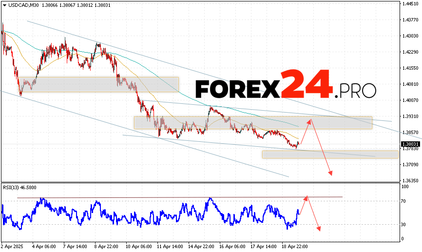 Canadian Dollar Forecast USDCAD for April 22, 2025 suggests an attempt to test the resistance area near the level of 1.3875. Further, a continuation of the fall to the area below the level of 1.3645. An additional signal in favor of the decline of the Canadian Dollar on Forex will be a test of the trend line on the relative strength indicator. Cancellation of the option of a fall in USD/CAD quotes will be a strong growth and a breakout of the level of 1.4015. This will indicate a continued rise in the value of the asset with a potential target above the level of 1.4265.