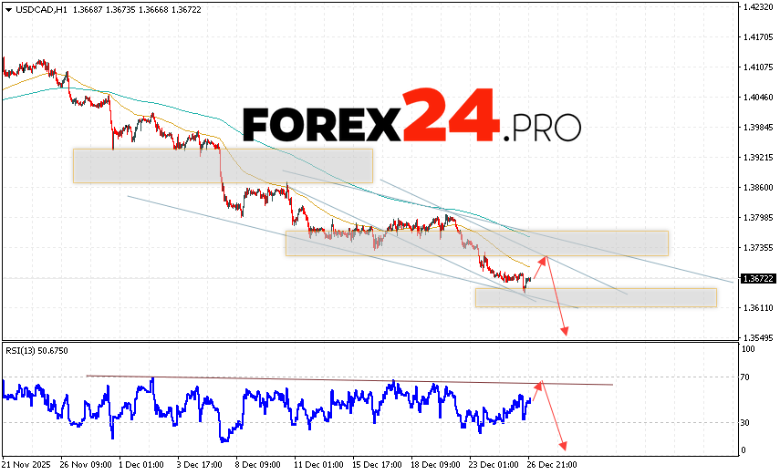 Canadian Dollar Forecast USDCAD for December 29, 2025 suggests an attempt to test the resistance area near 1.3755. Subsequently, a continued decline below 1.3555 is expected. An additional signal supporting a decline in the Canadian dollar on Forex will be a test of the resistance line on the relative strength indicator (RSI). A strong rally and a breakout of 1.3805 would cancel out the downward trend in USD/CAD. This would indicate continued price appreciation with a potential target above 1.3965.