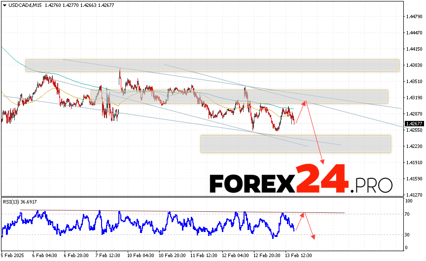 Canadian Dollar Forecast USDCAD for February 14, 2025 involves an attempt to test the resistance area near the level of 1.4295. Next, the continuation of the fall into the area below the level of 1.4175. An additional signal in favor of reducing the Canadian dollar on Forex will be the test line of the trend on the relative force indicator. The cancellation of the option of falling USD/CAD quotes will be a strong growth and a breakdown of level 1.4375. This will indicate a continuation of the rise in the value of the asset with a potential goal above the level of 1.4565.
