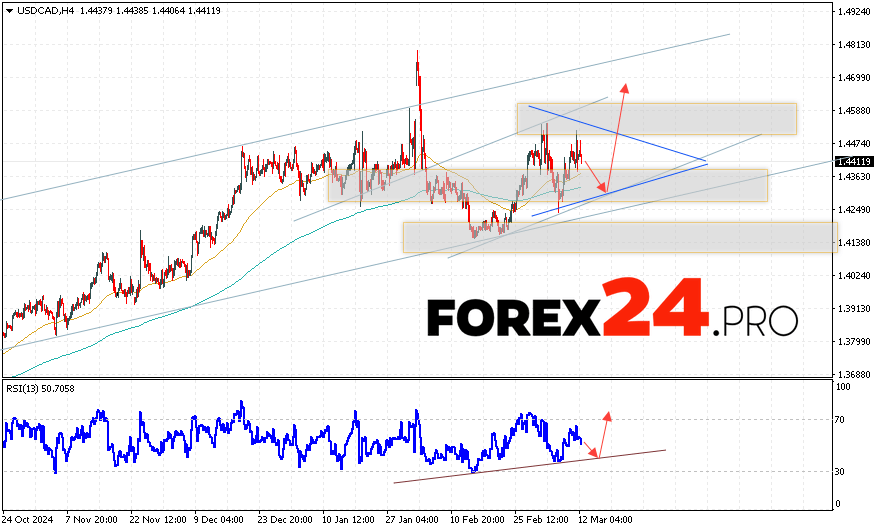 Canadian Dollar Forecast USDCAD for March 13, 2025 suggests an attempt to test the support area near the 1.4335 level. Further, continued growth to the area above the 1.4665 level. An additional signal in favor of the rise of the Canadian Dollar on Forex will be a test of the trend line on the relative strength indicator. The USD/CAD growth scenario will be cancelled by a fall and a breakout of the 1.4235 level. This will indicate a continued decline in the asset value with a potential target below the 1.4015 level.