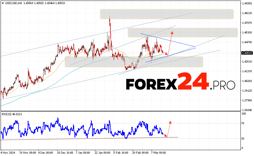 Canadian Dollar Forecast USDCAD for March 18, 2025 suggests an attempt to test the support area near the level of 1.4335. Further, continuation of growth to the area above the level of 1.4595. An additional signal in favor of the rise of the Canadian Dollar on Forex will be a test of the trend line on the relative strength indicator. The cancellation of the growth option of USD/CAD quotes will be a fall and a breakout of the level of 1.4245. This will indicate a continued decline in the asset’s value with a potential target below the 1.4035 level.
