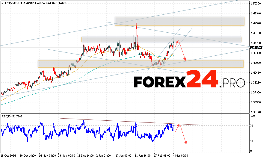 Canadian Dollar Forecast USDCAD for March 5, 2025 suggests an attempt to test the resistance area near 1.4375. Further, a continuation of the fall to the area below 1.4205. An additional signal in favor of the decline of the Canadian Dollar on Forex will be a test of the trend line on the relative strength indicator. Cancellation of the option of a fall in USD/CAD quotes will be a strong growth and a breakout of the 1.4625 level. This will indicate a continuation of the rise in the value of the asset with a potential target above the 1.4845 level.