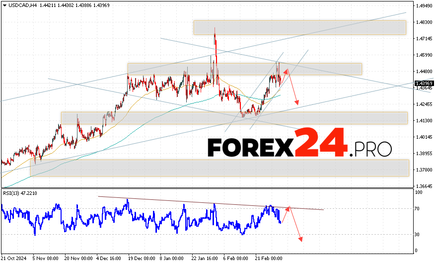 Canadian Dollar Forecast USDCAD for March 6, 2025 suggests an attempt to test the resistance area near 1.4475. Further, a continuation of the fall to the area below 1.4235. An additional signal in favor of the decline of the Canadian Dollar on Forex will be a test of the trend line on the relative strength indicator. The cancellation of the option of a fall in USD/CAD quotes will be a strong growth and a breakout of the 1.4615 level. This will indicate a continuation of the rise in the value of the asset with a potential target above the 1.4835 level.