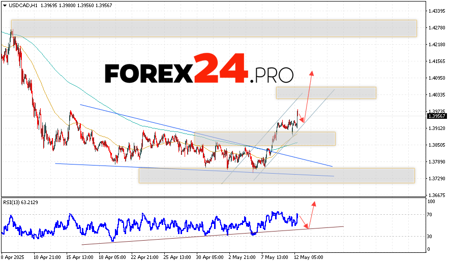 Canadian Dollar Forecast USDCAD for May 13, 2025 suggests an attempt to test the support area near the level of 1.3925. Further, the continuation of growth to the area above the level of 1.4115. An additional signal in favor of the rise of the Canadian Dollar on Forex will be a test of the trend line on the relative strength indicator. A fall and breakdown of the level of 1.3895 will cancel the variant of USD/CAD quotes growth. This will indicate the continuation of the decline in the value of the asset with a potential target below the level of 1.3635.