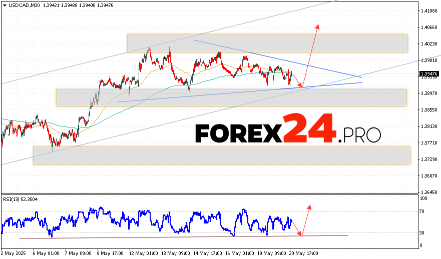 Canadian Dollar Forecast USDCAD for May 21, 2025 anticipates a test of the support area near the level 1.3905. Subsequently, continuation of growth towards an area above the level 1.4065. A bullish signal for the rise of the Canadian Dollar on Forex would be testing the trend line on the Relative Strength Index (RSI) indicator. Cancellation of the price increase scenario in USD/CAD quotes will come with a drop and breaking through the level 1.3665, indicating continued depreciation of the asset’s value with a potential target below the level 1.4015.
