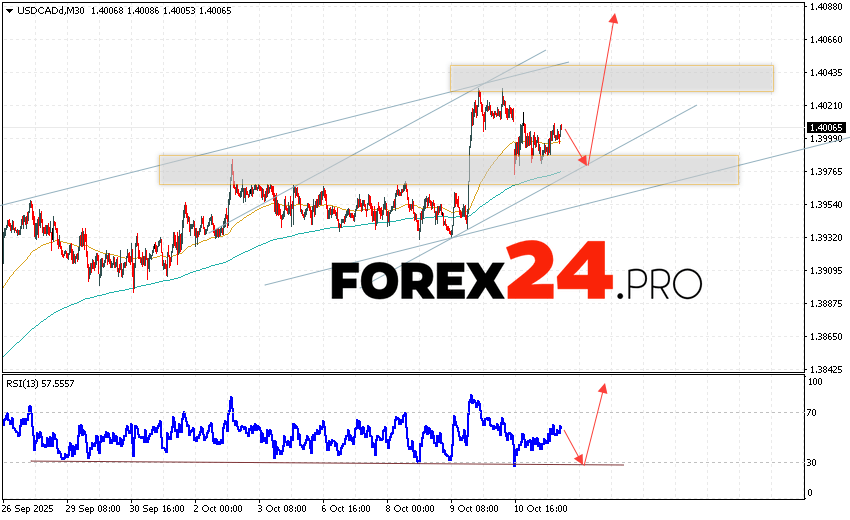 Canadian Dollar Forecast USD/CAD for October 14, 2025 suggests an attempt to test the support area near 1.3985. Subsequently, continued growth is expected above 1.4095. A test of the support line on the relative strength indicator (RSI) will be an additional signal for the Canadian dollar to rise on Forex. A decline and a break of 1.3955 would cancel out the upside potential for USD/CAD. This would indicate continued declines in the asset’s value, with a potential target below 1.3785.