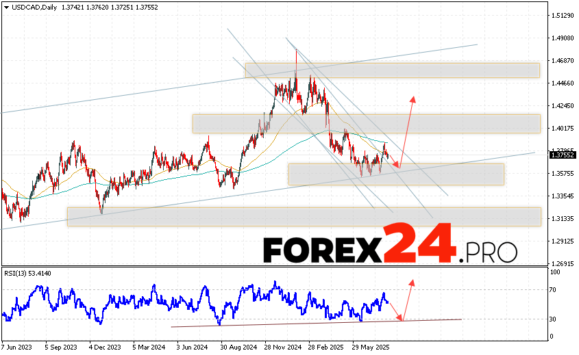 USD/CAD Weekly Forecast August 11 — 15, 2025 suggests an attempt to develop a bearish correction and test the support area near the 1.3725 level. Further, growth will continue with a target above the 1.4265 level. An additional signal in favor of growth will be a test of the trend line on the relative strength indicator. A fall and breakout of the 1.3435 area will cancel the upward trend. This will indicate a breakout of an important support level and a continuation of the decline with a target below 1.3015.