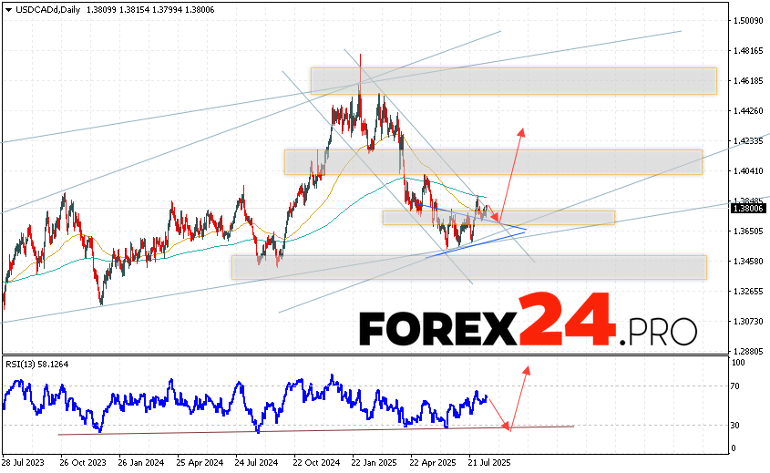 USD/CAD Weekly Forecast August 18 — 22, 2025 suggests an attempt at a bearish correction and a test of the support area near the 1.3745 level. Further, growth will continue with a target above the 1.4235 level. An additional signal in favor of growth will be a test of the trend line on the relative strength indicator. A fall and breakout of the 1.3435 area will cancel the upward trend. This will indicate a breakout of an important support level and a continuation of the decline with a target below 1.3065.