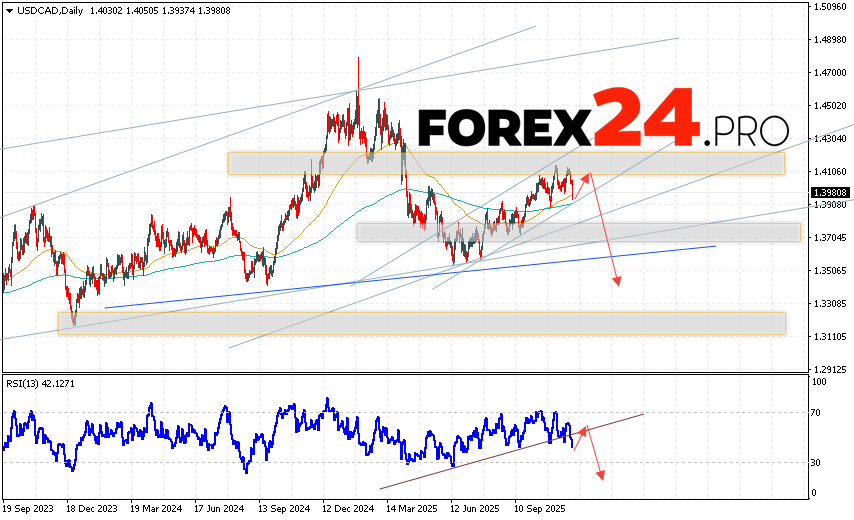 USD/CAD Weekly Forecast December 1 – 5, 2025 suggests an attempt to develop a bullish correction and test the resistance area near 1.4085. Further decline is then expected with a target below 1.3465. An additional signal of a decline would be a test of the trendline on the relative strength indicator. The downside potential would be cancelled by a strong rally and a breakout of the 1.4335 area. This will indicate a breakout of a key resistance level and continued growth with a target above 1.4685.