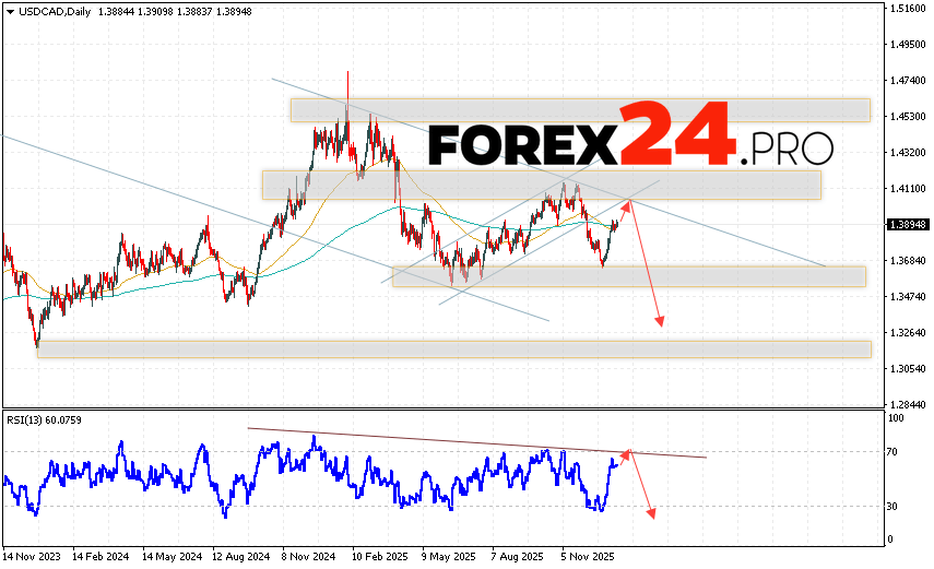 USD/CAD Weekly Forecast January 19 – 23, 2026 suggests an attempt to develop a bullish correction and test the resistance area near 1.3985. Further decline is then expected with a target below 1.3265. An additional signal favoring a decline would be a test of the resistance line on the relative strength indicator. A strong rally and a breakout of the 1.4185 area would cancel out the downward trend. This would indicate a breakout of a key resistance level and a continued rise with a target above 1.4375.