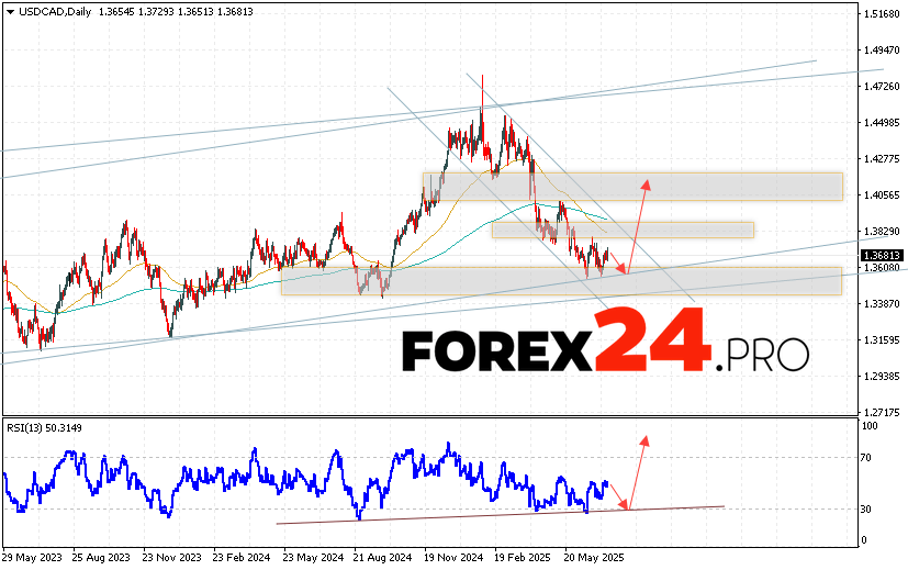 USD/CAD Weekly Forecast July 14 — 18, 2025 suggests an attempt to develop a bearish correction and test the support area near the 1.3585 level. Further, growth will continue with a target above the 1.4075 level. An additional signal in favor of growth will be a test of the trend line on the relative strength indicator. A fall and breakout of the 1.3435 area will cancel the upward trend. This will indicate a breakout of an important support level and a continuation of the decline with a target below 1.3125.