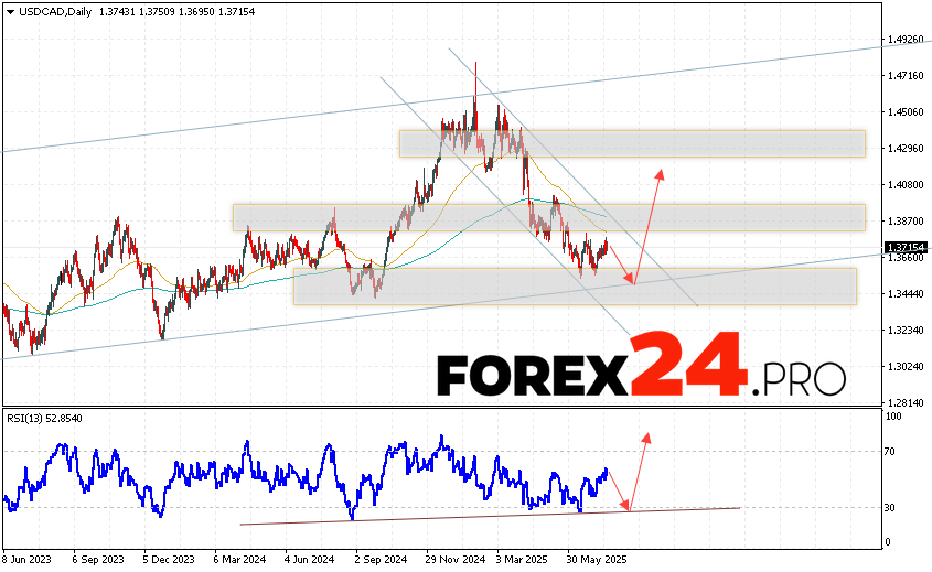 USD/CAD Weekly Forecast July 21 — 25, 2025 suggests an attempt to develop a bearish correction and test the support area near the 1.3545 level. Further, growth will continue with a target above the 1.4125 level. An additional signal in favor of growth will be a test of the trend line on the relative strength indicator. A fall and breakout of the 1.3365 area will cancel the rise scenario. This will indicate a breakout of an important support level and a continuation of the fall with a target below 1.3085.
