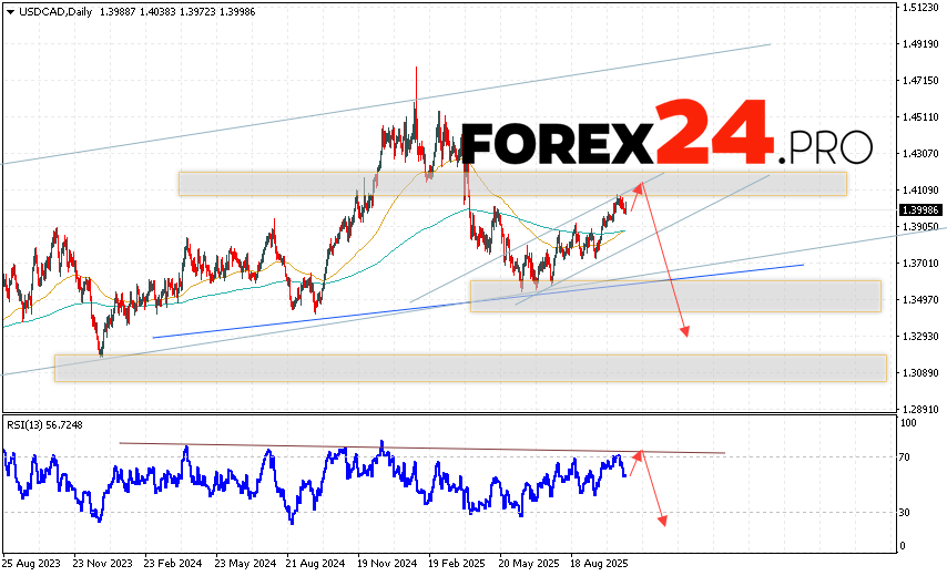 USD/CAD Weekly Forecast October 27 – 31, 2025 suggests an attempt to develop a bullish correction and test the resistance area near 1.4115. Further decline is then expected with a target below 1.3315. An additional signal in favor of a decline would be a test of the trend line on the relative strength indicator. A strong rally and a breakout of the 1.4285 area would cancel out the downward trend. This would indicate a breakout of a key resistance level and a continued rise with a target above 1.4665.