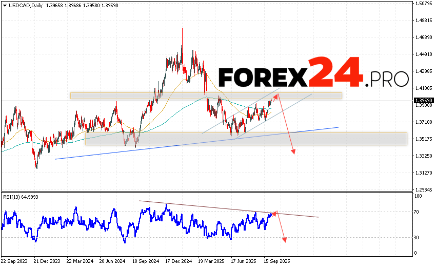 USD/CAD Weekly Forecast October 6 — 10, 2025 suggests an attempt to develop a bullish correction and test the resistance area near 1.4035. Further decline is then expected with a target below 1.3345. An additional signal in favor of a decline would be a test of the trend line on the relative strength indicator. A strong rally and a breakout of the 1.4175 area would cancel out the downward trend. This would indicate a breakout of a key resistance level and a continued rise with a target above 1.4465.