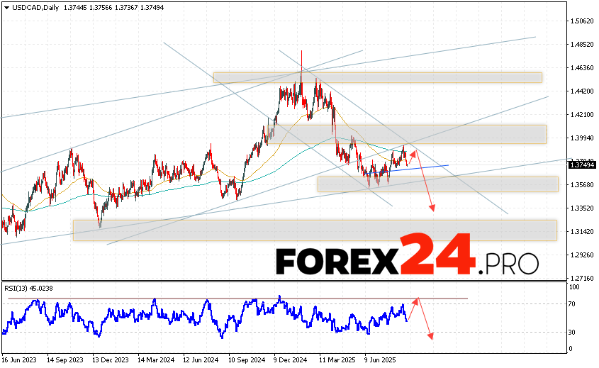 USD/CAD Weekly Forecast September 1 — 5, 2025 suggests an attempt to develop a bullish correction and test the resistance area near the 1.3805 level. Further, continued decline with a target below the 1.3365 level. An additional signal in favor of a decline will be a test of the trend line on the relative strength indicator. The cancellation of the fall scenario will be a strong growth and a breakout of the 1.4005 area. This will indicate a breakout of an important resistance level and a continuation of the rise with a target above 1.4275.