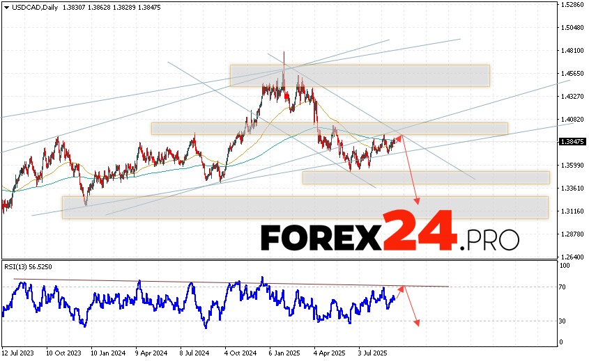 USD/CAD Weekly Forecast September 15 – 19, 2025 suggests an attempt to develop a bullish correction and test the resistance area near the 1.3875 level. Further, continued decline with a target below the 1.3325 level. An additional signal in favor of a decline will be a test of the trend line on the relative strength indicator. The cancellation of the fall scenario will be a strong growth and a breakout of the 1.4065 area. This will indicate a breakout of an important resistance level and a continuation of the rise with a target above 1.4295.