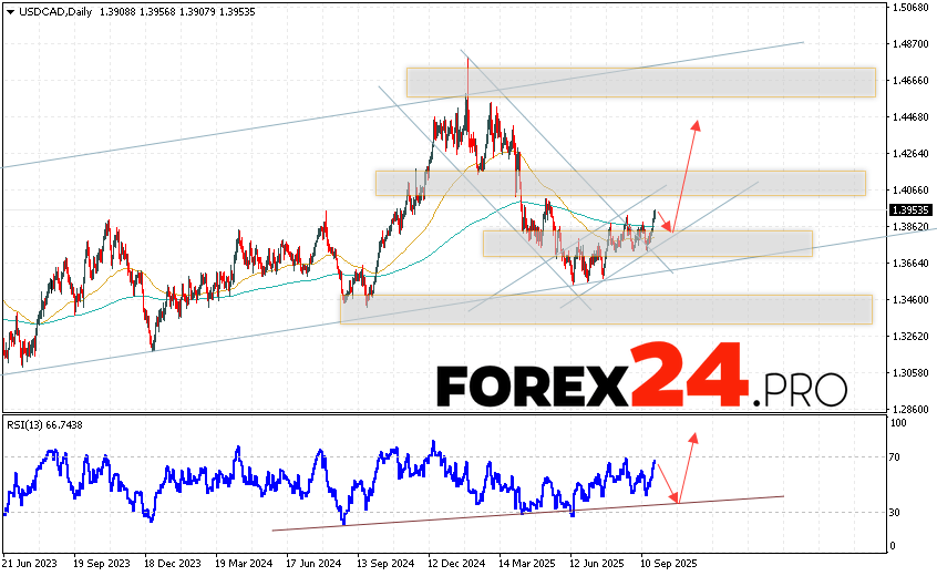 USD/CAD Weekly Forecast September 29 — October 3, 2025 suggests an attempt to develop a bearish correction and test the support area near 1.3845. Further growth is then expected with a target above 1.4465. An additional signal in favor of an upward trend will be a test of the trend line on the relative strength indicator. The upward trend will be cancelled by a decline and a breakout of the 1.3725 area. This will indicate a break of a key support level and a continued decline with a target below 1.3485.