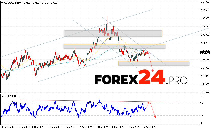 USD/CAD Weekly Forecast September 8 – 12, 2025 suggests an attempt to develop a bullish correction and test the resistance area near the 1.3845 level. Further, continued decline with a target below the 1.3365 level. An additional signal in favor of a decline will be a test of the trend line on the relative strength indicator. The cancellation of the fall scenario will be a strong growth and a breakout of the 1.4035 area. This will indicate a breakout of an important resistance level and a continuation of the rise with a target above 1.4285.