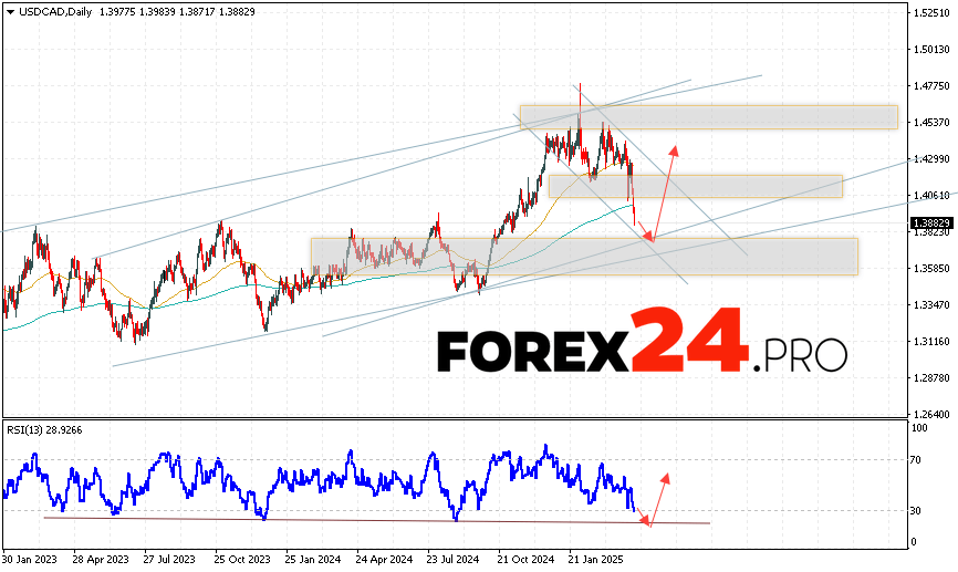 USD/CAD Weekly Forecast April 14 — 18, 2025 suggests an attempt to develop a bearish correction and test the support area near 1.3365. Further, continuation of growth with a target above 1.4305. An additional signal in favor of growth will be a test of the trend line on the relative strength indicator. The cancellation of the growth option will be a fall and a breakout of the 1.3575 area. This will indicate a breakout of an important support level and a continuation of the fall with a target below 1.3325.