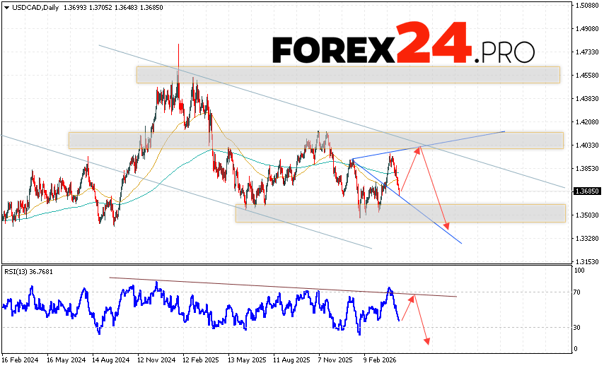 USDCAD Weekly Forecast April 20 – 24, 2026 suggests an attempt to develop a bullish correction and test the resistance area near 1.3995. Further decline is then expected with a target below 1.3345. An additional signal supporting a decline will be a test of the resistance line on the relative strength indicator (RSI). A strong rally and a breakout of the 1.4235 area would cancel out the downward scenario. This would indicate a breakout of a key resistance level and a continued rise with a target above 1.4575.