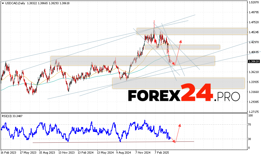 USD/CAD Weekly Forecast April 21 — 25, 2025 suggests an attempt to develop a bearish correction and test the support area near 1.3795. Further, continuation of growth with a target above 1.4315. An additional signal in favor of growth will be a test of the trend line on the relative strength indicator. The cancellation of the growth option will be a fall and a breakout of the 1.3595 area. This will indicate a breakout of an important support level and a continuation of the fall with a target below 1.3345.
