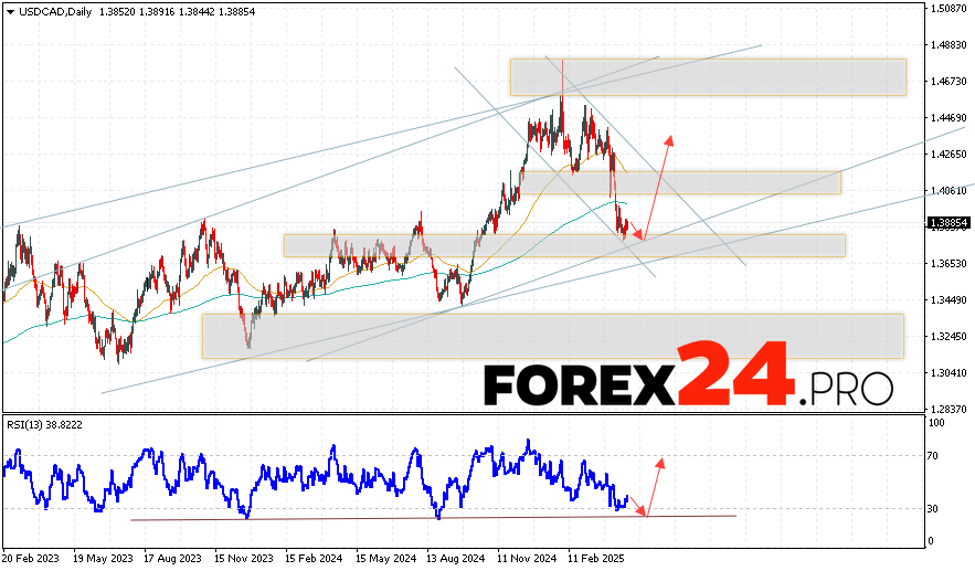 USD/CAD Weekly Forecast April 28, 2025 — May 2, 2025 suggests an attempt to develop a bearish correction and test the support area near 1.3865. Further, continuation of growth with a target above 1.4325. An additional signal in favor of growth will be a test of the trend line on the relative strength indicator. The cancellation of the growth option will be a fall and a breakout of the 1.3595 area. This will indicate a breakout of an important support level and a continuation of the fall with a target below 1.3365.