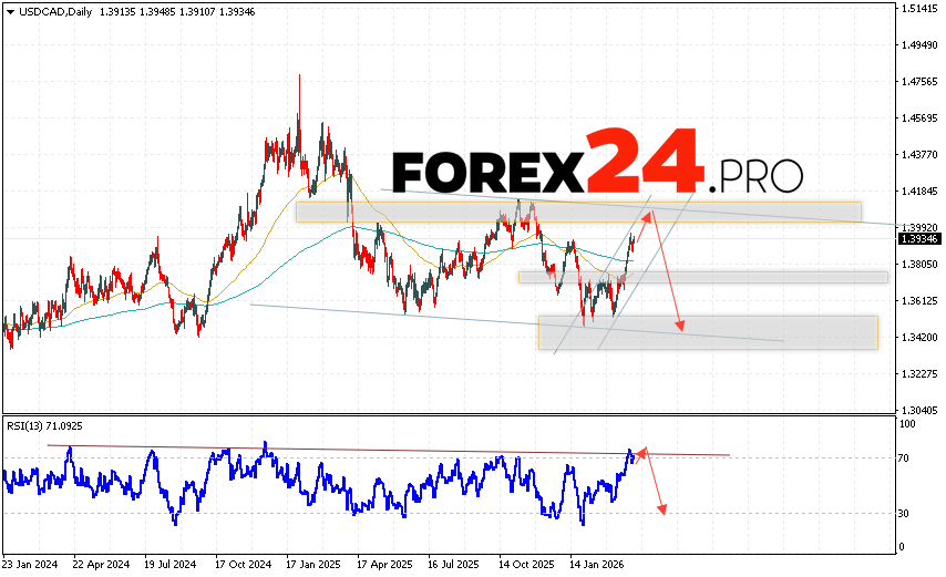 USDCAD Weekly Forecast April 6 – 10, 2026 suggests an attempt to develop a bullish correction and test the resistance area near 1.3995. Further decline is then expected with a target below 1.3435. An additional signal in favor of a decline would be a test of the resistance line on the relative strength indicator. The downward price action would be cancelled by a strong rally and a breakout of the 1.4225 area. This will indicate a breakout of a key resistance level and a continued rise with a target above 1.4465.