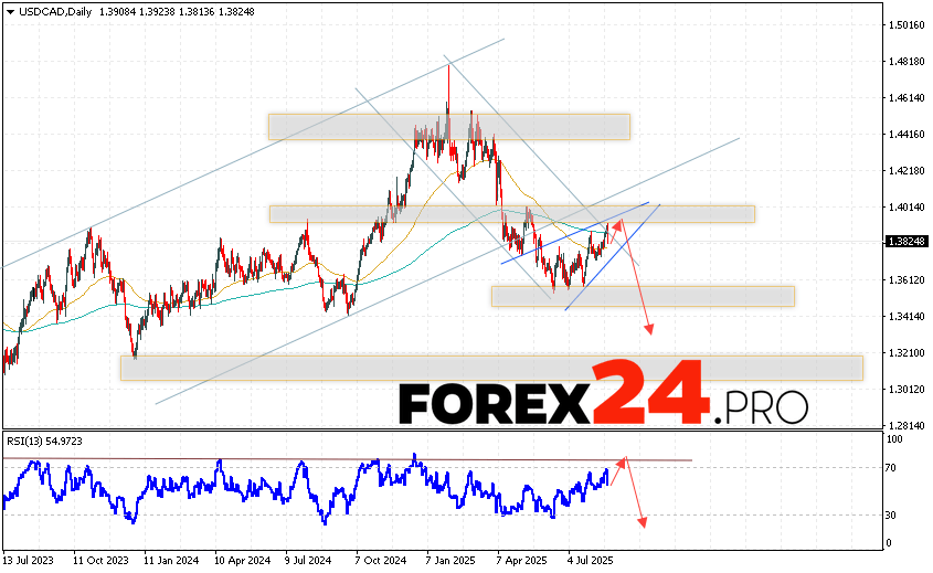 USDCAD Weekly Forecast August 25 — 29, 2025 suggests an attempt to develop a bullish correction and test the resistance area near the 1.3905 level. Further, continued decline with a target below the 1.3375 level. An additional signal in favor of a decline will be a test of the trend line on the relative strength indicator. The cancellation of the fall scenario will be a strong growth and a breakout of the 1.4045 area. This will indicate a breakout of an important resistance level and a continuation of the rise with a target above 1.4285.