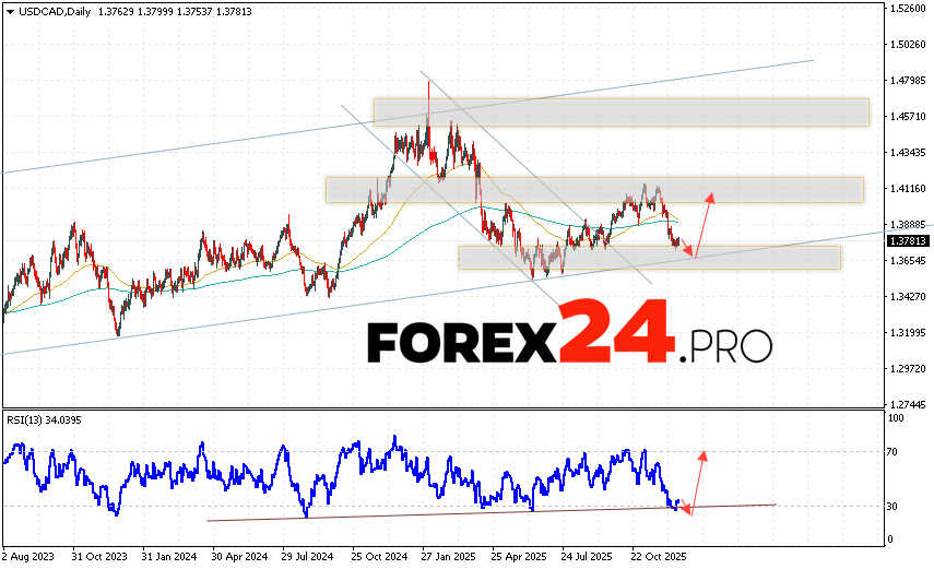 USDCAD Weekly Forecast December 22 – 26, 2025 suggests an attempt to develop a bearish correction and test the support area near 1.3645. Further growth is then expected with a target above 1.3055. An additional signal favoring a decline would be a test of the support line on the relative strength indicator. The upside potential would be cancelled by a decline and a breakout of the 1.3505 area. This will indicate a break of a key support level and a continued decline with a target below 1.3225.