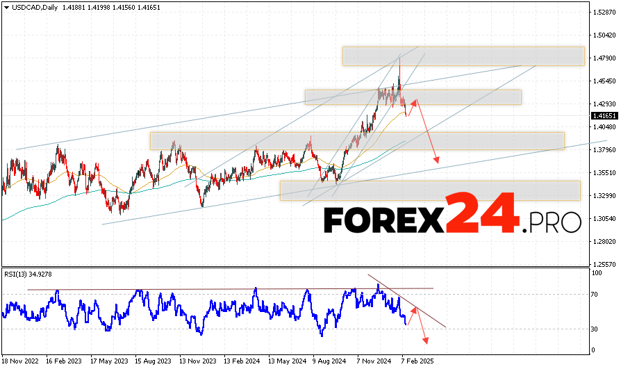 USD/CAD Weekly Forecast February 17 — 21, 2025 suggests an attempt to develop a bullish correction and test the resistance area near 1.4295. Further, continuation of the fall with a target below 1.3725. An additional signal in favor of the decline will be a test of the trend line on the relative strength indicator. Cancellation of the decline development option will be strong growth and a breakout of the 1.4705 area. This will indicate a breakout of an important resistance level and continued growth with a target above 1.4985.
