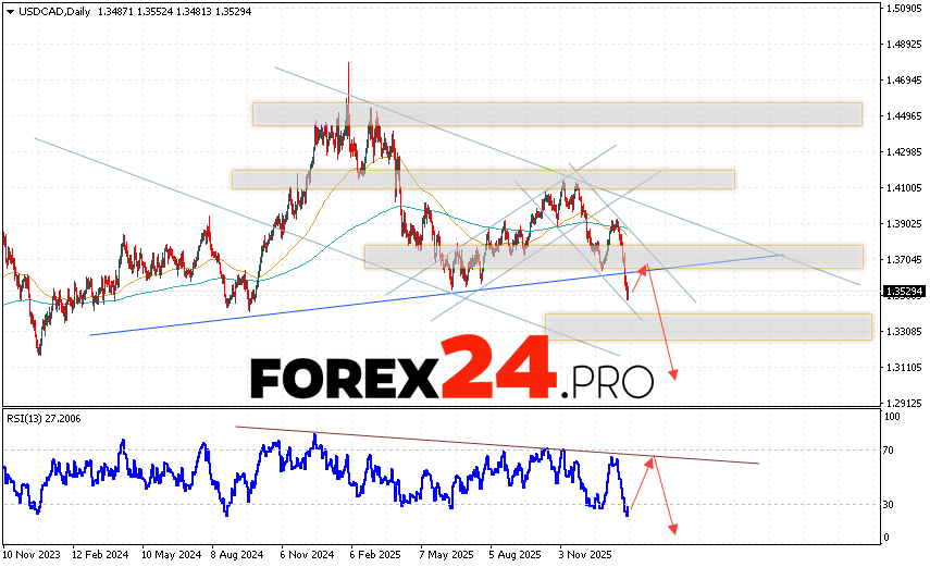 USDCAD Weekly Forecast February 2 – 6, 2026 suggests an attempt to develop a bullish correction and test the resistance area near 1.3685. Further decline is expected with a target below 1.3095. An additional signal favoring a decline would be a test of the resistance line on the relative strength indicator. A strong rally and a breakout of the 1.3975 area would cancel out the downward trend. This would indicate a breakout of a key resistance level and a continued rise with a target above 1.4265.
