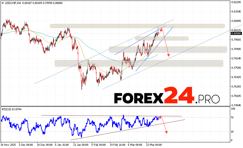 USD/CHF Forecast Dollar Franc for April 1, 2026 suggests an attempt to develop a bullish correction and test the resistance area near 0.8025. Further decline in the USD/CHF currency pair is expected, with a target below 0.7845. A rebound from the trend line on the relative strength indicator (RSI) would be an additional signal for a decline in the USD/CHF pair. A strong rally and a breakout of 0.8105 would cancel out the downside scenario. This would indicate a breakout of the resistance level and continued growth, with a potential target above 0.8235.