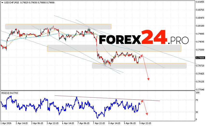 USD/CHF Forecast Dollar Franc for April 10, 2026 suggests an attempt to develop a bullish correction and test the resistance area near 0.7915. Further decline in the USD/CHF currency pair is expected, with a target below 0.7815. A rebound from the trend line on the relative strength indicator (RSI) would be an additional signal for a decline in the USD/CHF pair. A strong rally and a breakout of 0.7965 would cancel out the downside scenario. This would indicate a breakout of the resistance level and continued growth, with a potential target above 0.8145.