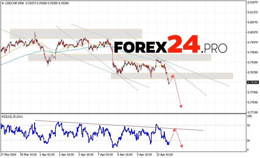 USD/CHF Forecast Dollar Franc for April 14, 2026 suggests an attempt at a bullish correction and a test of the resistance area near 0.7865. Subsequently, the USD/CHF currency pair is expected to continue to decline, with a target below 0.7735. A rebound from the trendline on the relative strength indicator (RSI) would be an additional signal supporting a decline in the USD/CHF pair. A strong rally and a breakout of 0.7925 would cancel out the downward scenario. This would indicate a breakout of the resistance level and continued growth, with a potential target above 0.8045.