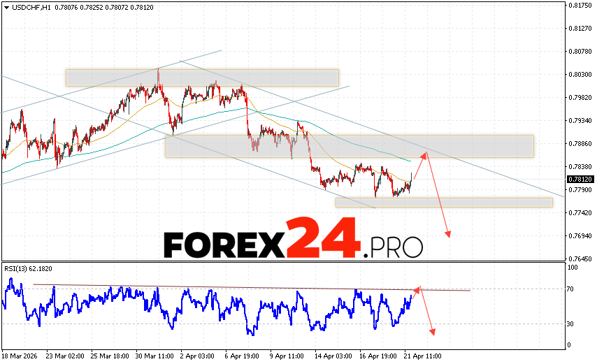 USD/CHF Forecast Dollar Franc for April 22, 2026 suggests an attempt at a bullish correction and a test of the resistance area near 0.7840. Subsequently, the USD/CHF currency pair is expected to continue to decline, with a target below 0.7695. A rebound from the trend line on the relative strength indicator (RSI) will be an additional signal supporting a decline in the USD/CHF pair. A strong rally and a breakout of 0.7905 will cancel out the downward scenario. This would indicate a breakout of the resistance level and continued growth, with a potential target above 0.8085.