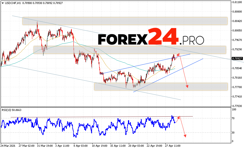 USD/CHF Forecast Dollar Franc for April 29, 2026 suggests an attempt to develop a bullish correction and test the resistance area near 0.7915. Further decline in the USD/CHF currency pair is expected, with a target below 0.7785. A rebound from the trend line on the relative strength indicator (RSI) would be an additional signal supporting a decline in the USD/CHF pair. A strong rally and a breakout of 0.7945 would cancel out the downside scenario. This would indicate a breakout of the resistance level and continued growth, with a potential target above 0.8105.